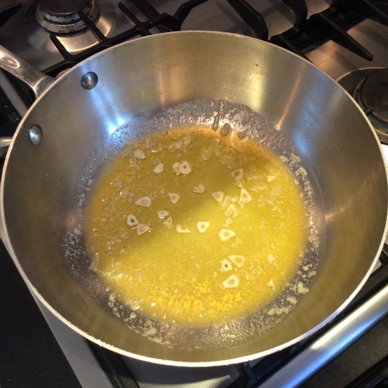 Melt a good chunk of butter (around 100g) in a pan and before it bubbles add the garlic.