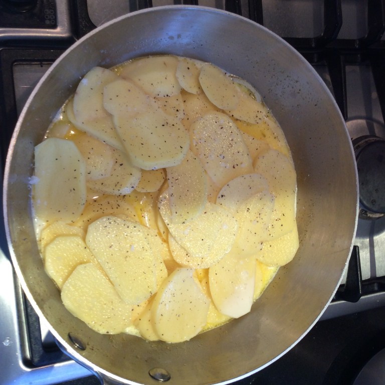 Peel and slice the potatoes, enough to fill your oven dish about 3/4 full. Thinly slice an onion and a garlic clove.