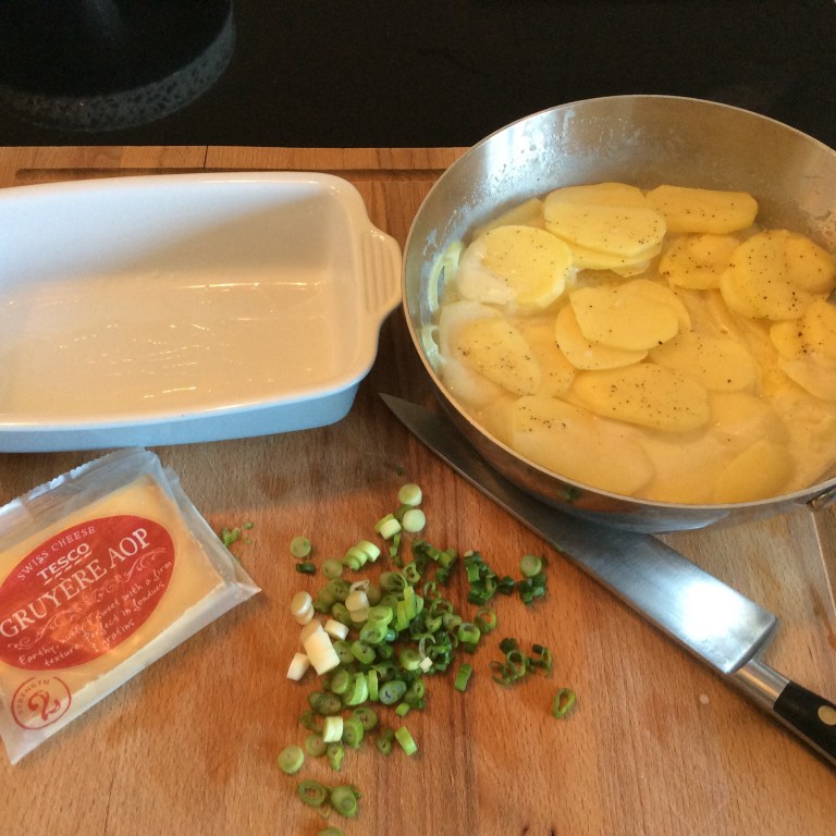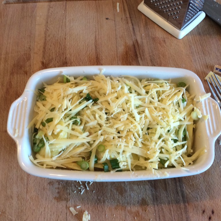 Put the potatoes into an oven dish, top with sliced spring onions (optional) and grated cheese. I prefer gruyere but cheddar is fine also.