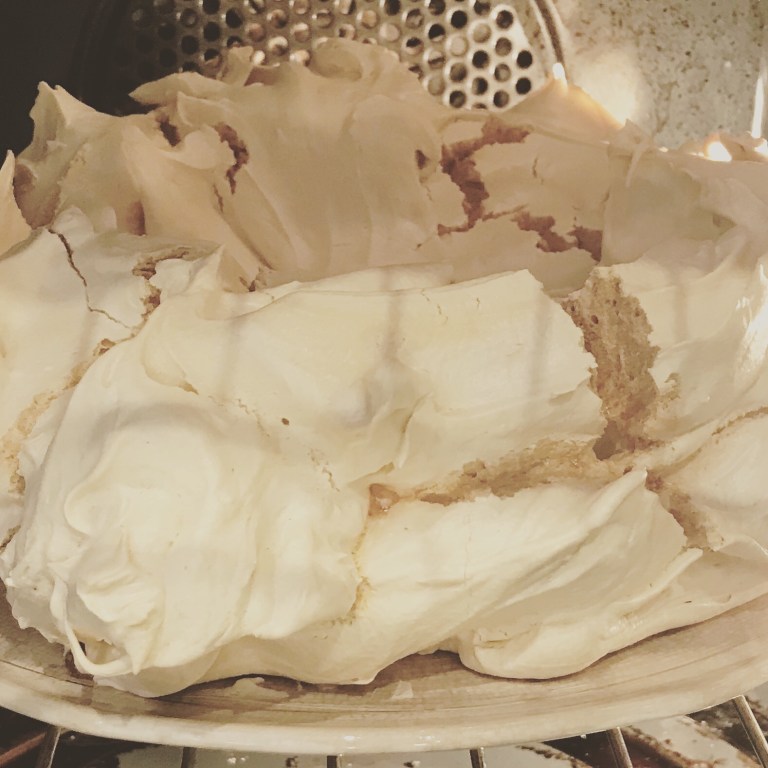 Bake at 140 degrees c for 1 hour 45 minutes. Don’t open the oven while cooking. Turn the oven off and leave the pav in the oven to cool, with the door slightly ajar (or it will collapse).