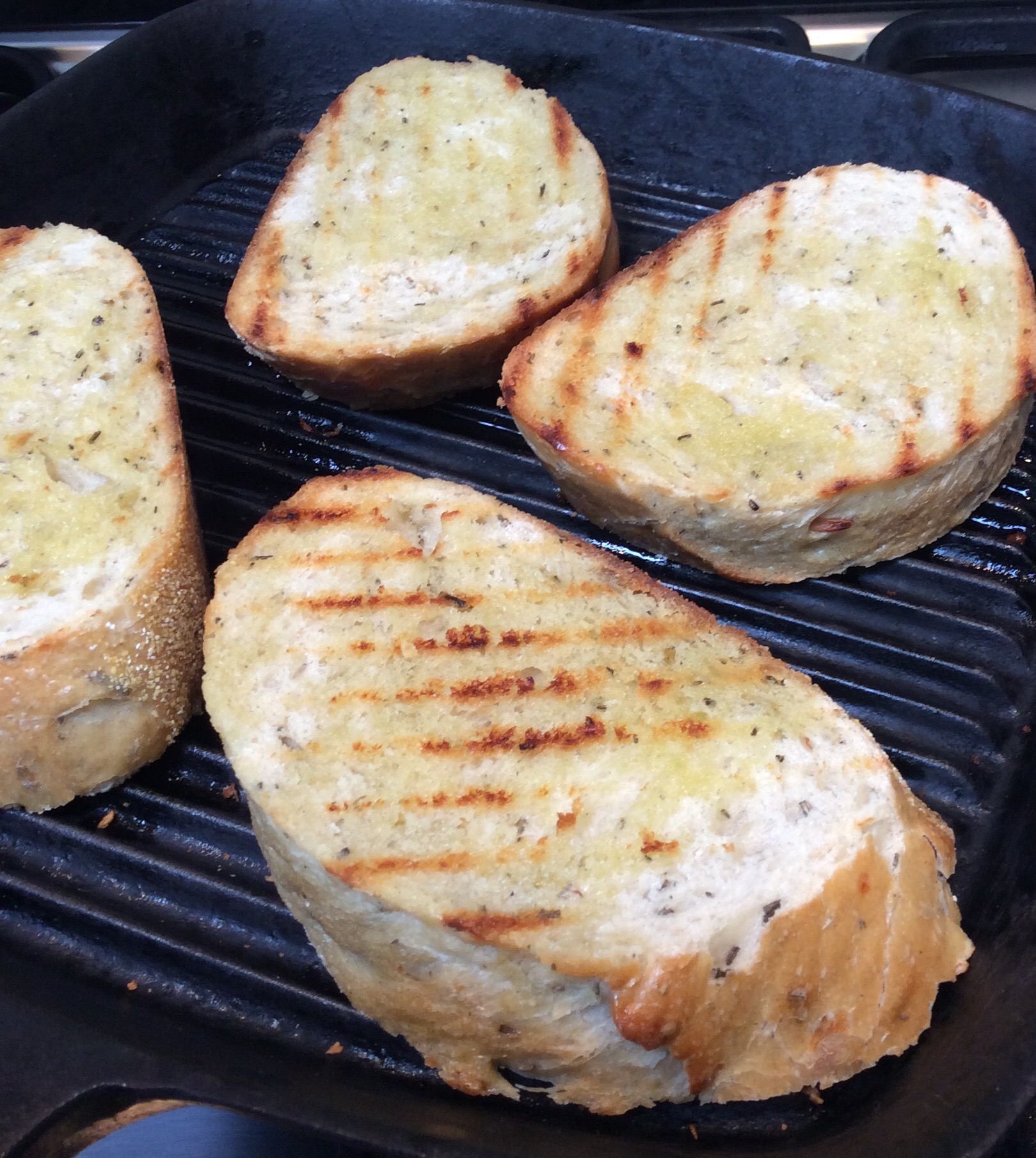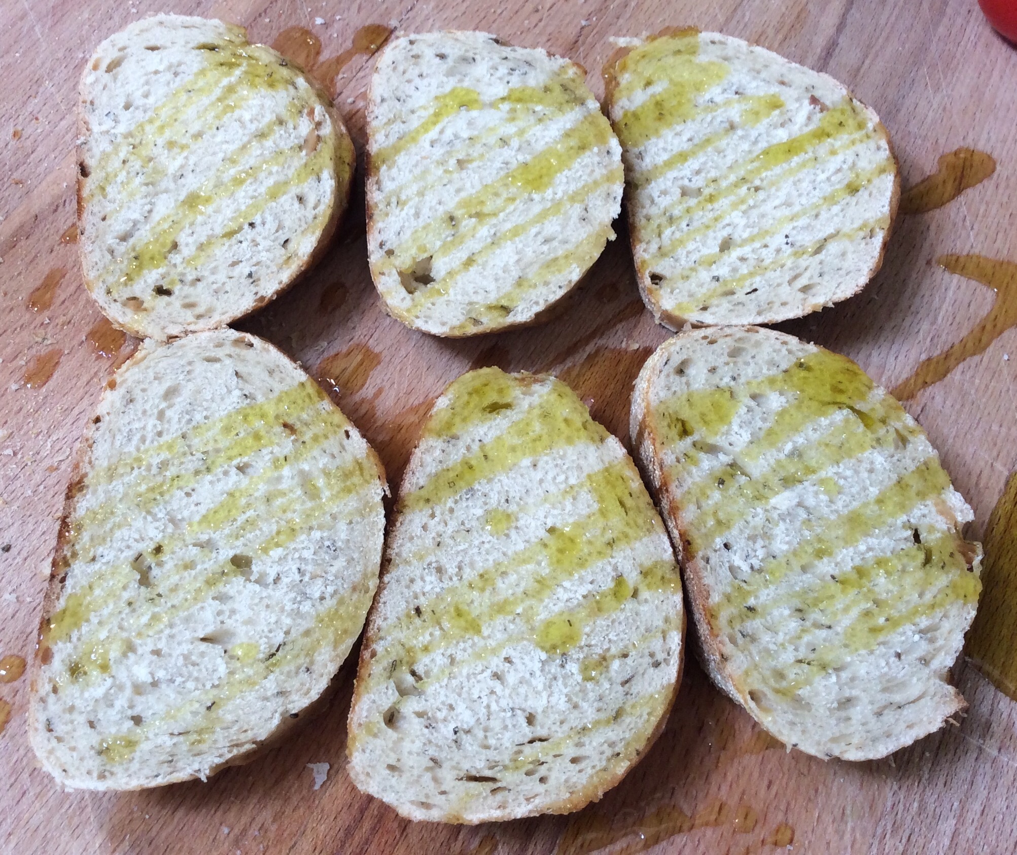 Slice the bread about an inch thick and drizzle with olive oil. Toast on a griddle pan or pop it under the grill.