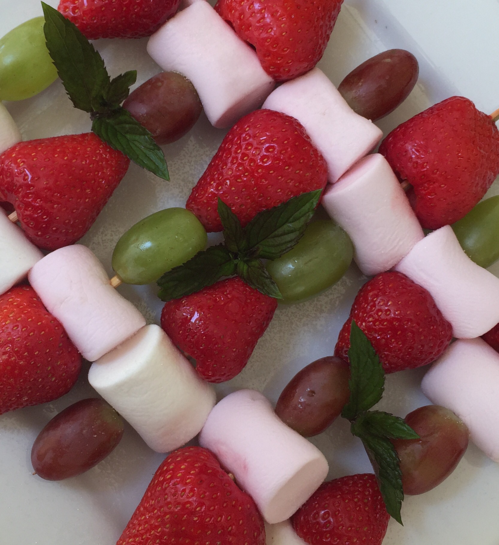 This is a simple idea for kids parties – simply thread fruit onto skewers. You need fruit which is solid so that it will stay on the skewer; but not fruit that will brown (like apples). Strawberries, grapes, melon and pineapple are great. Here we’ve added marshmallows for an extra treat.