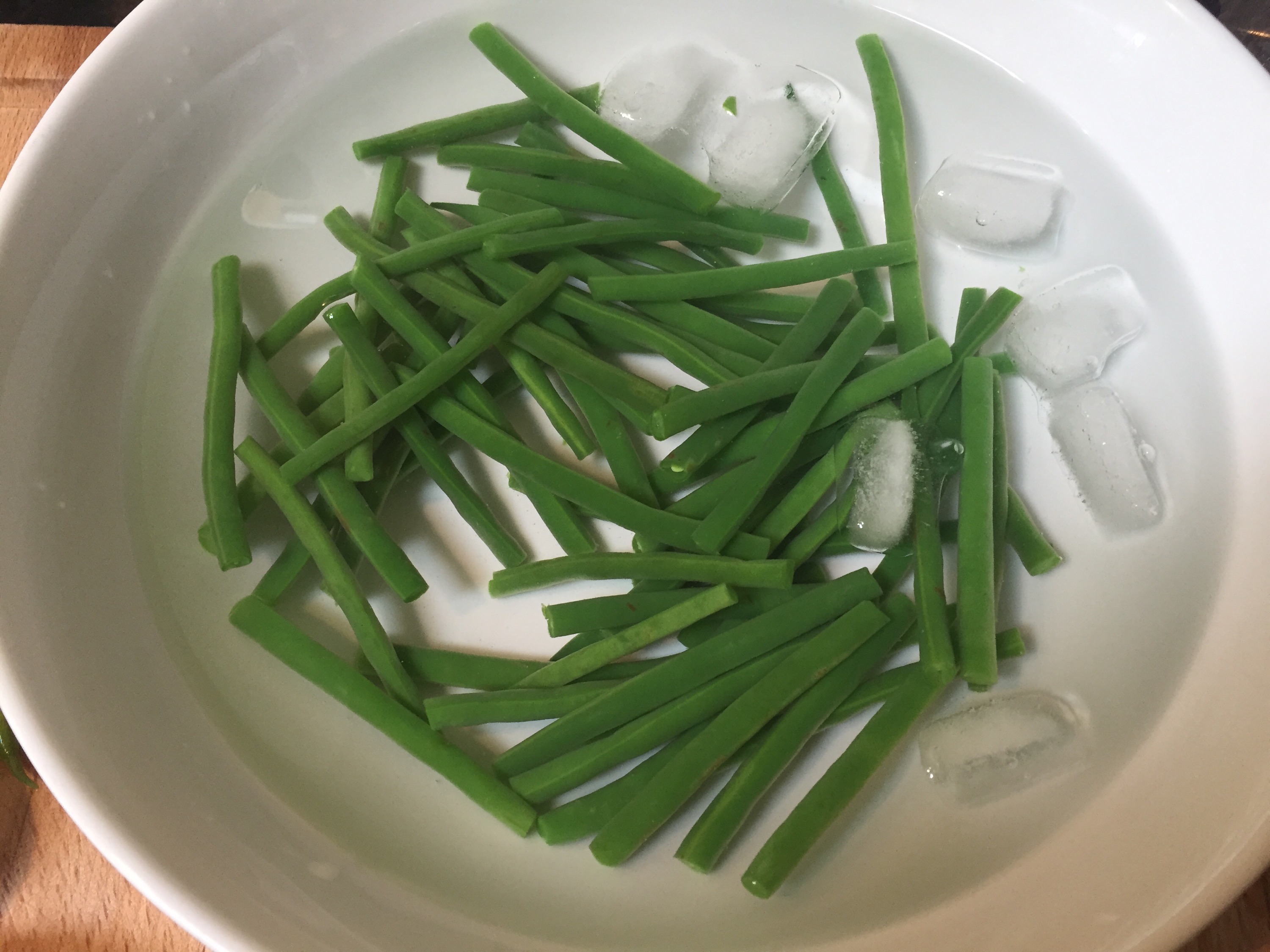 - Bring two small saucepans of water to the boil, drop the trimmed beans into one and simmer for just a couple of minutes, drain and pop into a bowl of cold water – this blanching process gives you a crisp green bean for your salad.