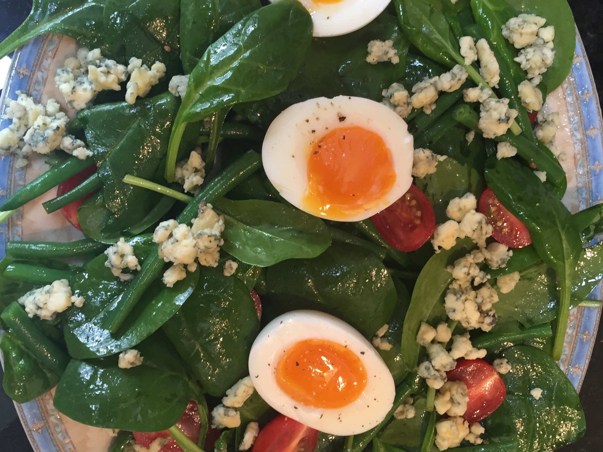 Sprinkle the blue cheese over the top and finally the halved soft boiled eggs. Finish with a little ground pepper and sea salt.
