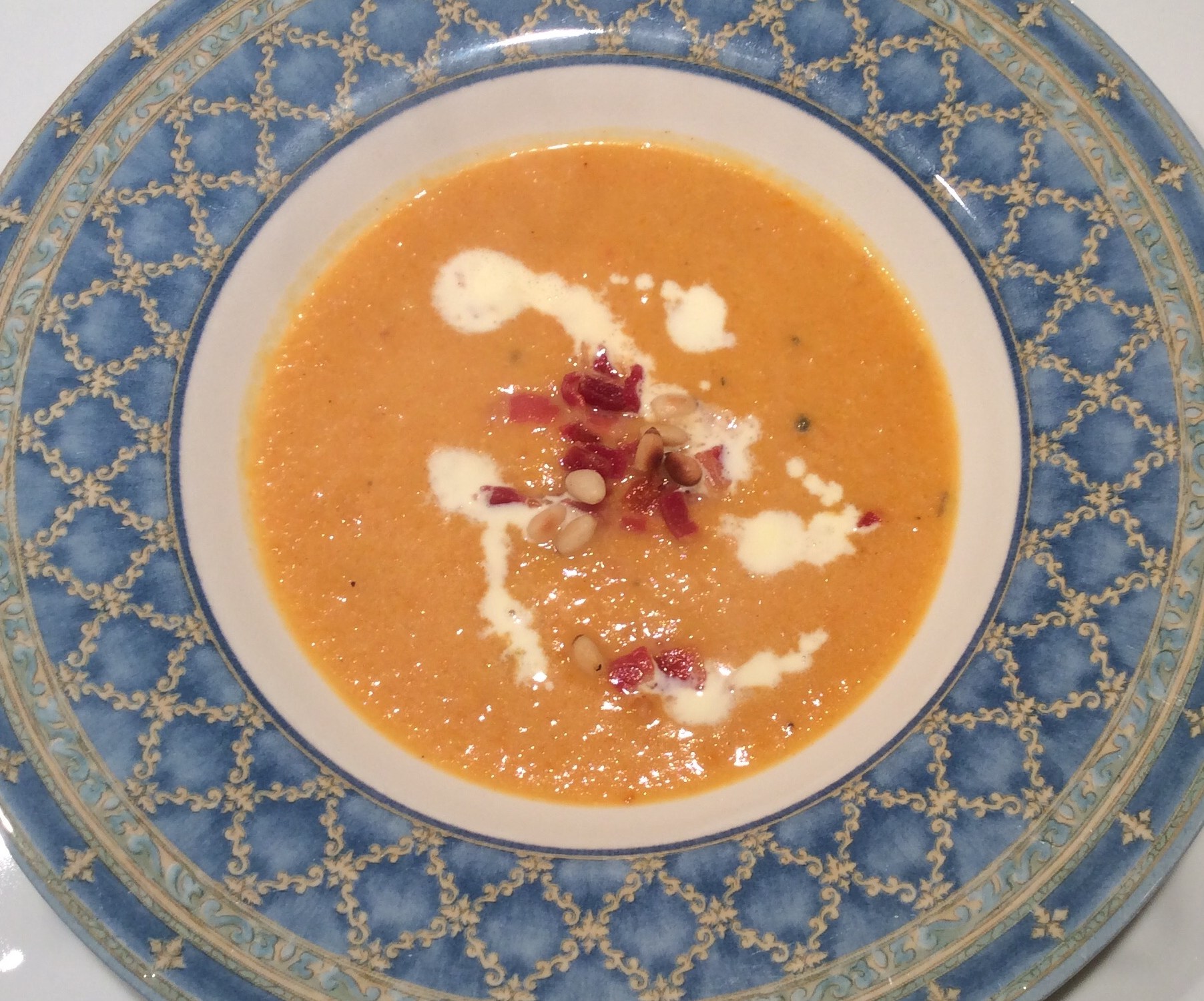 Serve with a drizzle of cream (or cream fraiche) and a sprinkle of pine nuts and pancetta.