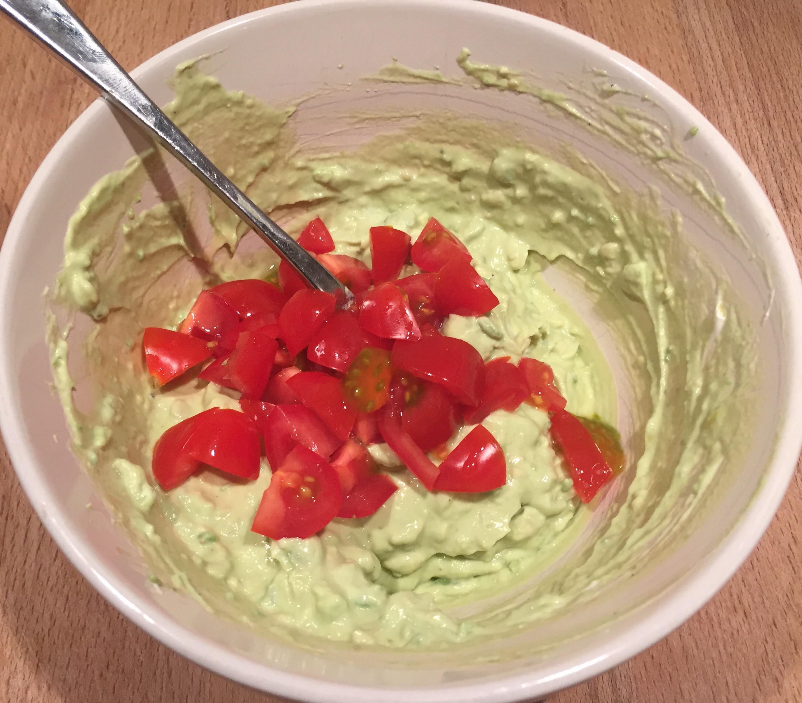 You leave the tomato out as otherwise your guacamole will lose its vibrant green colour. Check for seasoning, then gently fold the diced tomato through and serve straight away.