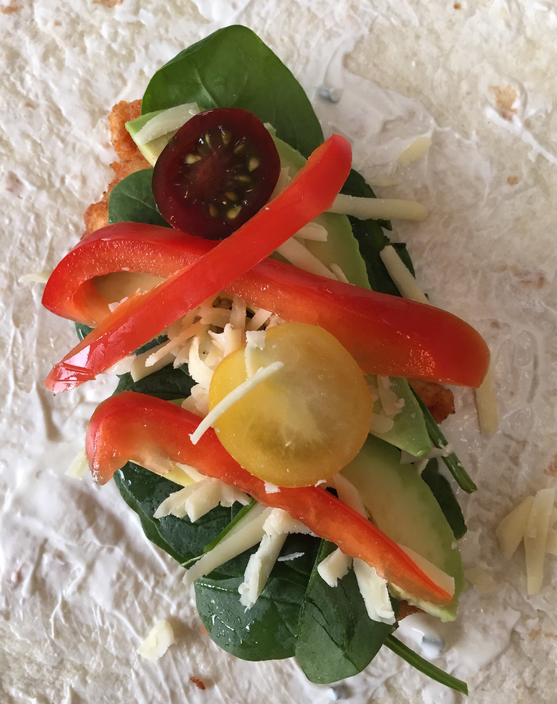 Mix some mayonnaise with a crushed garlic clove and a handful of finely chopped chives. Spread over your wrap and place the cooked chicken on top.