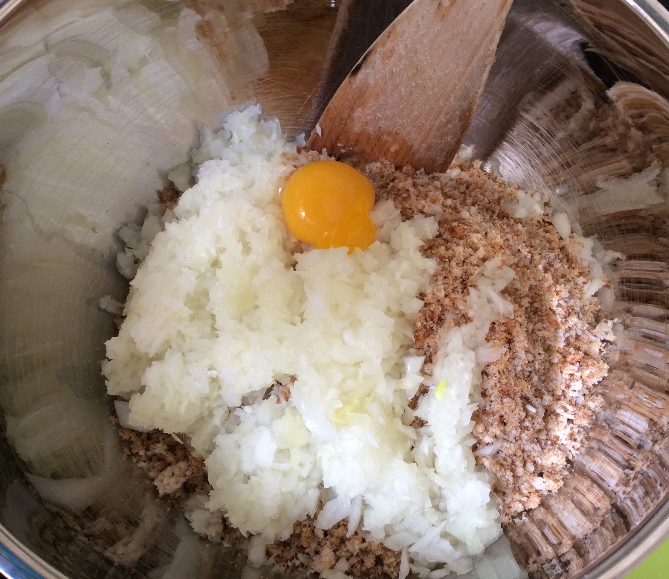 Whizz up the bread into fine breadcrumbs. Pour into a large bowl. Peel the onion and whizz it until finely chopped. Add to the breadcrumbs. Add the egg yolk, salt & pepper, a tablespoon of chopped fresh herbs or a dessert spoon of dried mixed herbs. Combine and press into a small oven proof serving dish. An alternative and really yummy stuffing ingredient is grated mushroom. For this quantity of stuffing I would use 5 medium sized white mushrooms, wiped and grated.