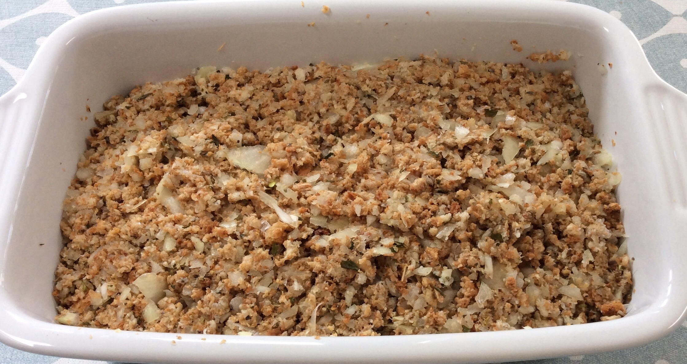 Stuffing is so easy to make and it’s a great way to use up the bread crusts that everyone leaves discarded and rejected in the bread bin. I whip the crusts out before they go too stale and shove them into a ziplock bag in the freezer. Then when I need to make breadcrumbs I take them out, defrost them and whizz them up in the magimix.