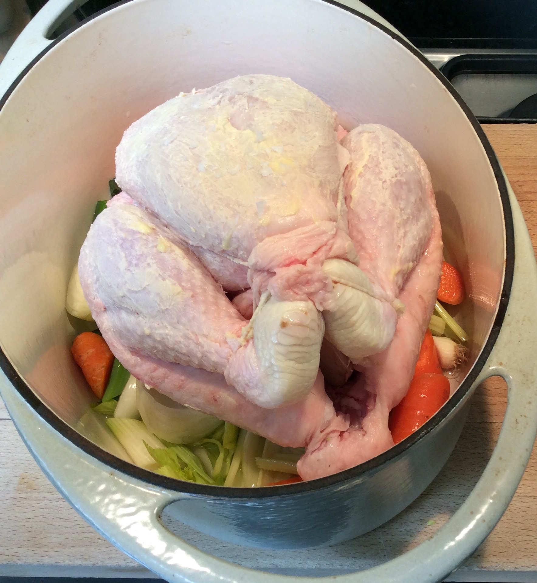 I then cover the vegetables with water and then lay the chicken on top. I often flavour the chicken by popping a stabbed lemon, thyme and garlic cloves in the cavity. I rub the chicken with butter, not oil for pot roasting as and drips will help enrich the gravy later.