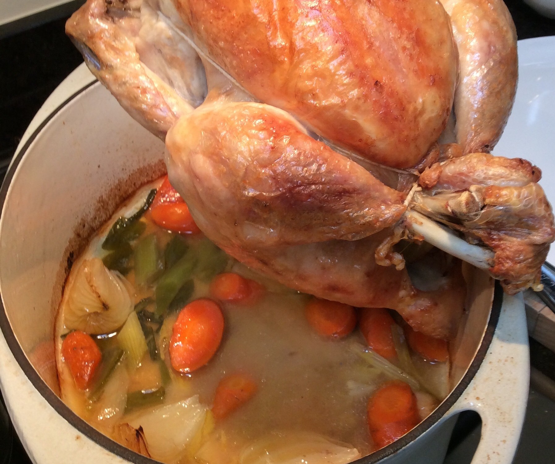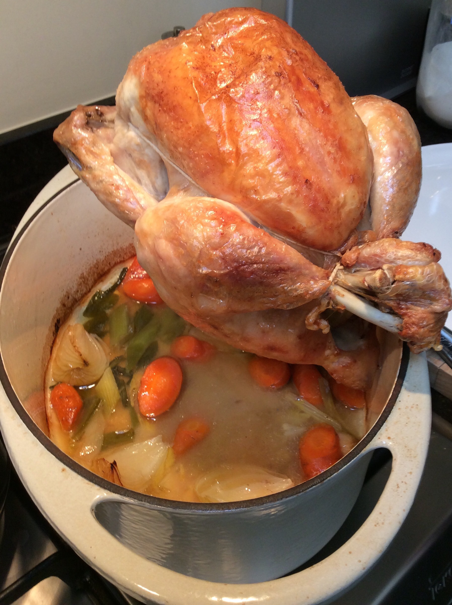 Back to the chook – after 70 minutes turn the heat back up to 200° and take the lid off to get the chicken golden brown. At this stage I pop my part cooked potatoes into the hot oven, on a separate tray in goose or duck fat to cook. After 20 minutes, take the chicken out and lift out of the pot with a large fork, allowing all rage juices drip back into the pot.