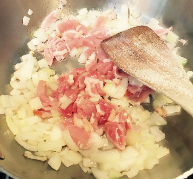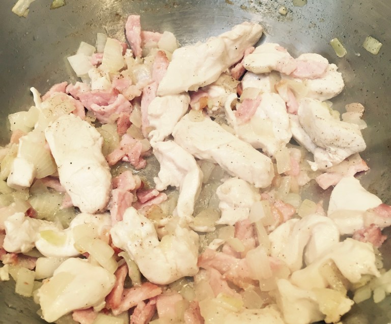 Now add the sliced chicken to the onion and bacon and fry gently.
