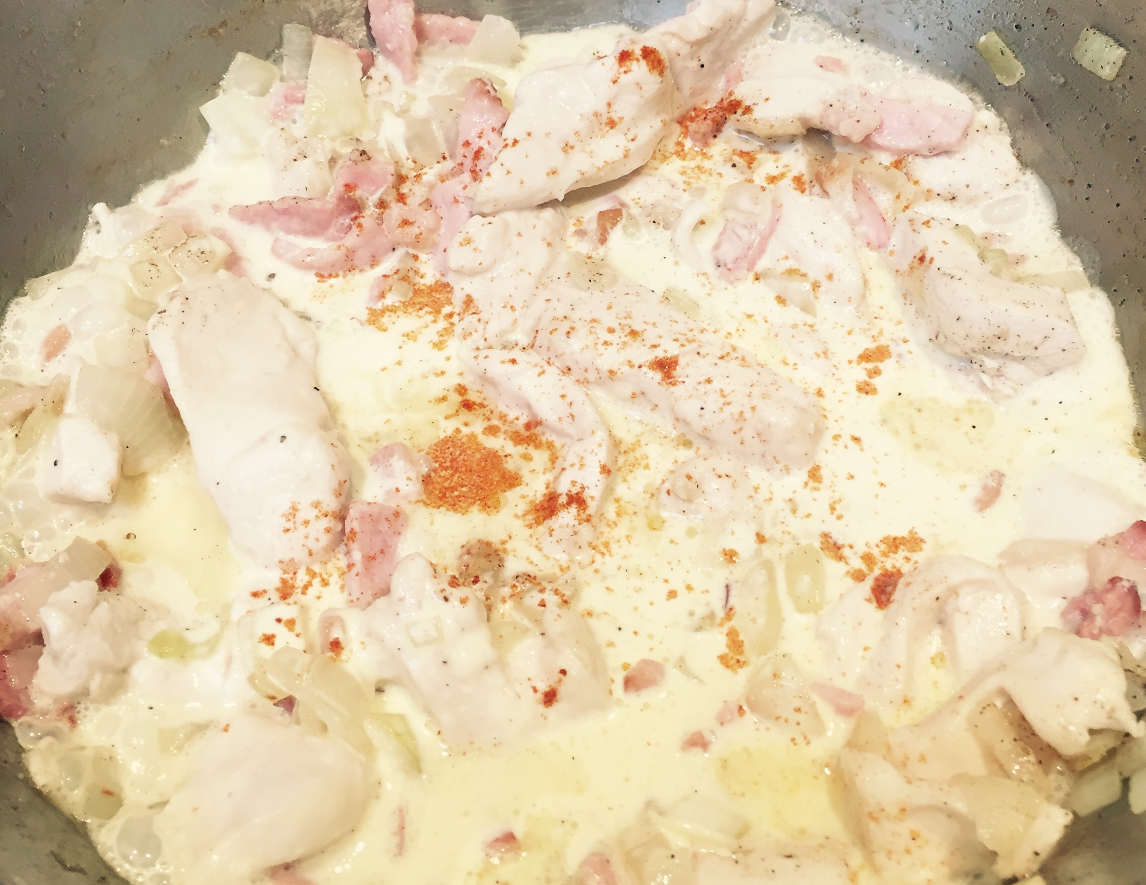 Add the white wine and cook for a few minutes, before adding the cream, salt, ground black or white pepper, a pinch of paprika and a good shaving of parmesan to taste. Simmer for a few minutes.
