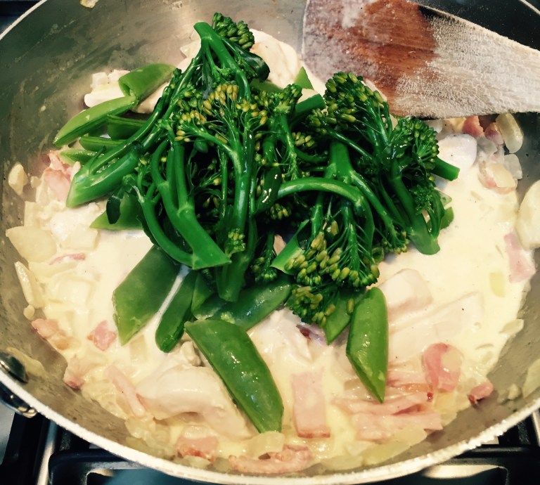 Now add the broccolini, sugar snaps and gnocchi to the sauce and gently stir. Check your seasoning and serve dredged in parmesan.