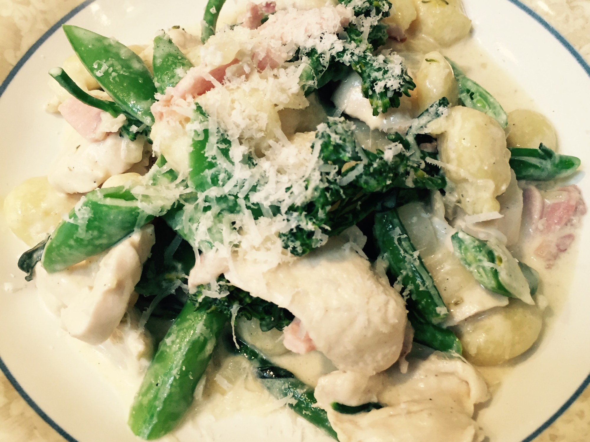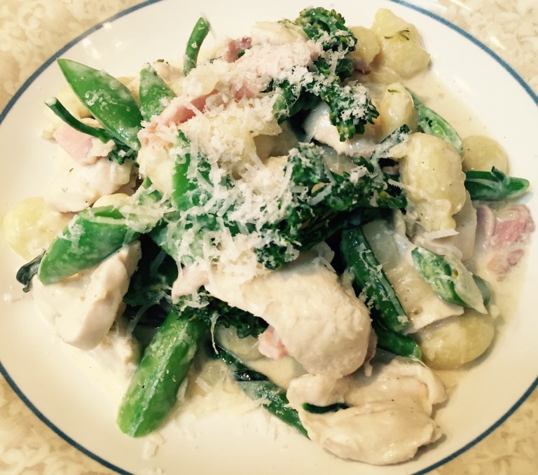 Silken gnocchi with the crunch of broccolini and sugar snaps peas in a rich alfredo sauce – heaven. You can easily leave the chicken out of this recipe and it isn’t a real alfredo sauce – more of a cheats version but it makes for a really quick supper.