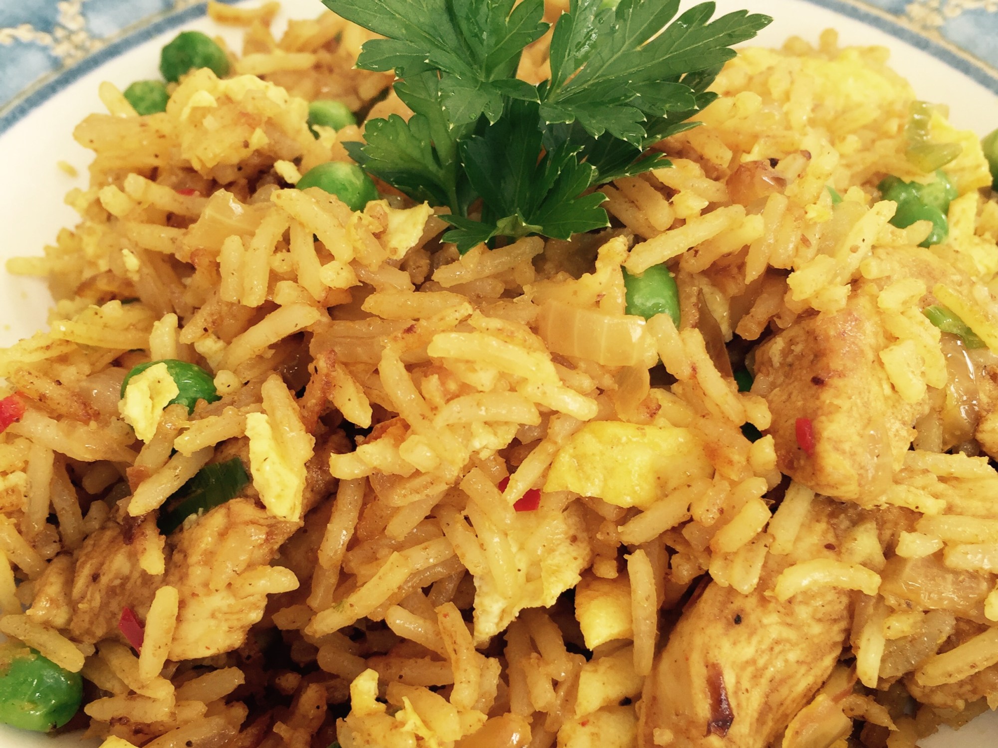 I’ve been eating this for as long as I can remember. Fried rice is a family favourite and there are a number of versions of the recipe. You can substitute the chicken for pork, beef or prawns, even a meaty fish like monkfish would work really well. Nasi is better the next day, so whilst you definitely need to season with salt, don’t over season it as the flavours mature. Some recipes drop the curry in favour of soy sauce – but when using soy sauce reduce or omit the salt completely. Instead of peas, little broccoli florets are good, as are fried mushrooms. Avoid adding anything too wet as it will make your rice soggy.