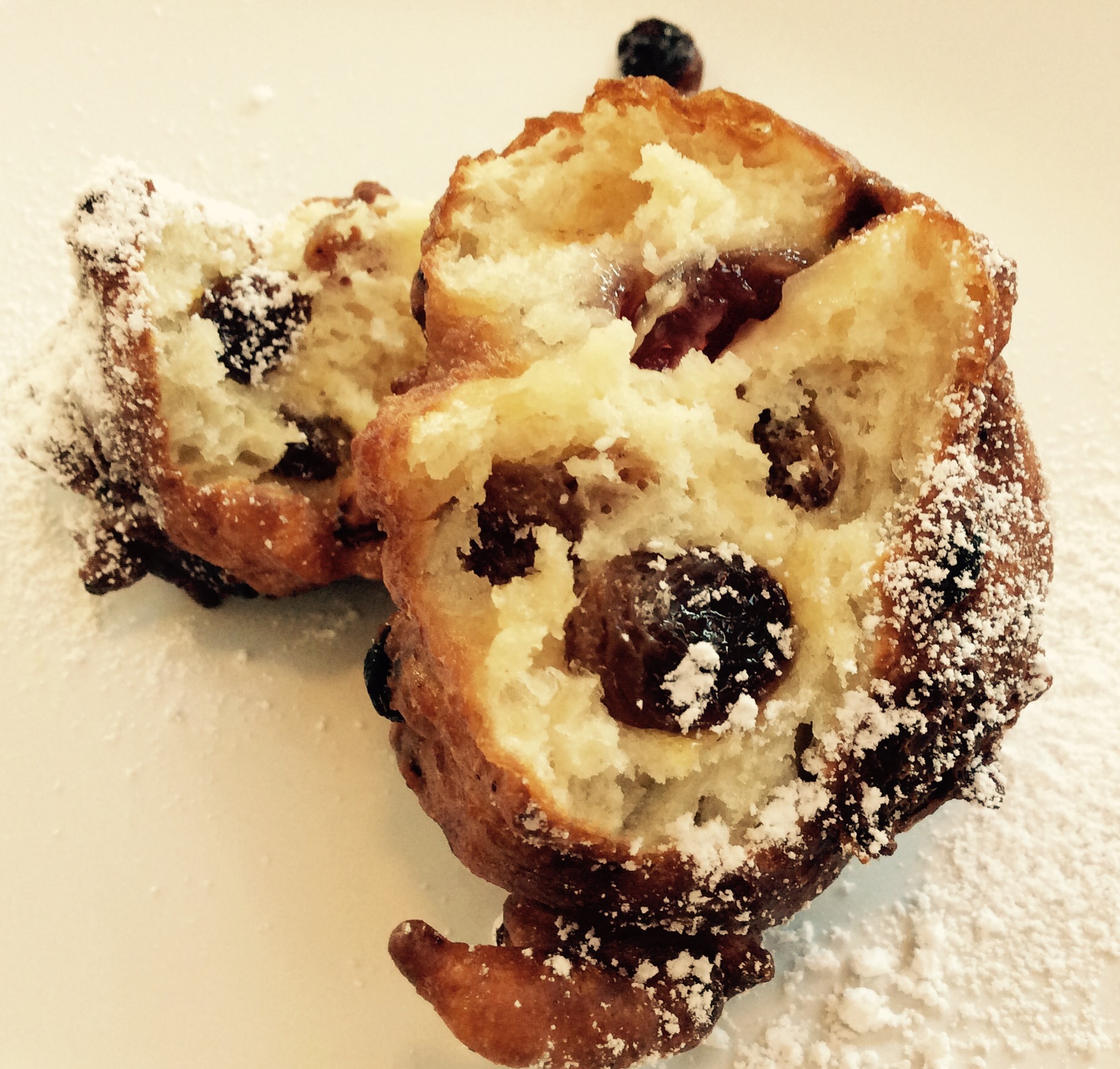 Heat a large deep pan with vegetable oil (or use a deep fat fryer). When hot drop in large tablespoon sized rounds. Don’t make them too large or the dough won’t be cooked through. This quantity of dough mixture will make around 18 small / medium Oliebollen as it puffs out when it cooks.