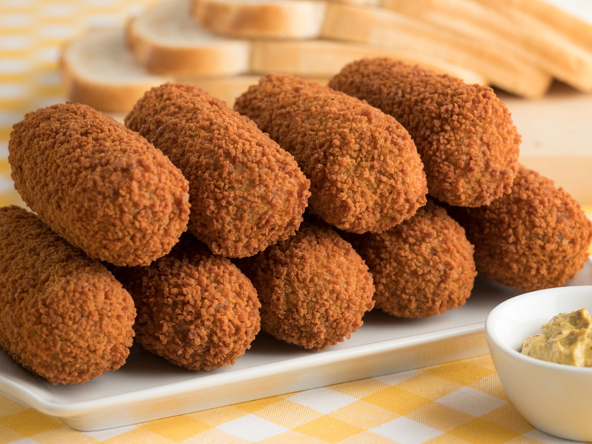 - In a very large pot or deep fat fryer, heat the oil until hot. Gently lower the croquette in, in batches and fry until golden to dark brown.