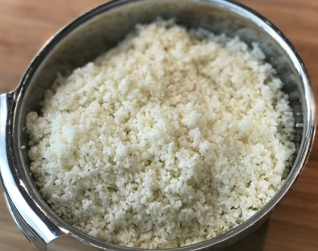 Simply, remove the green leaves from the cauliflower and whizz up in a food processor until it resembles rice.