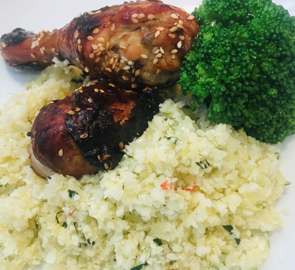 Add a tbsp of olive oil to a sauté pan and add the cauliflower rice, season and sauté until soft – this will take up to 10 minutes depending on how much cauliflower you are using. Serve warm with any dish that you would have traditionally served rice with. Its really great with a salmon fillet!
