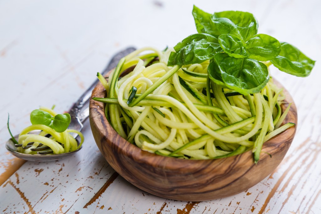 While the bolognaise is simmering, heat bring the remaining stock to the boil in a saucepan. Trim the ends off your courgette and using either a spiralizer or a peeler, create long strips of the vegetable. About 5 minutes before you want to serve, poach the courgette in the stock for just a few minutes. Drain, drizzle with olive oil, season with salt and pepper, a drizzle of lemon juice and serve with the lentil bolognaise. If you are eating dairy, you can shave some parmesan cheese to finish. Delish!